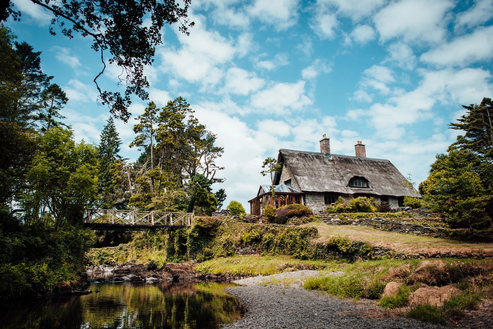 Located in the heart of the Glengarriff Woods Nature Reserve in County Cork, the Glengarriff Lodge is a charming thatched roof cottage that was originally a hunting lodge of the Earls of Bantry. It is an ideal venue for rustic and boho elopements with a small group of guests. The former hunting lodge can sleep up to 8 people on site and offers facilities for intimate weddings of up to 20-30 guests.