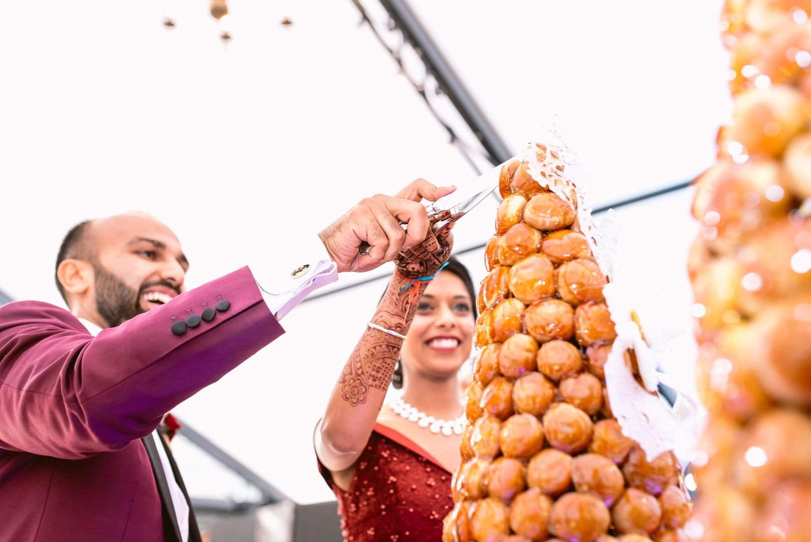 Croquembouche is a tower of pastry puffs piled together using caramel threads to form a cone-shaped delight for the cake cutting ceremony.