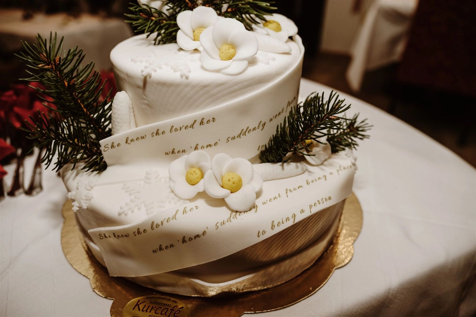 Unique wedding cake? How about this white cake for our couple’s elopement with a parchment-like element? Fitting for booklovers like this couple who got married in Germany.