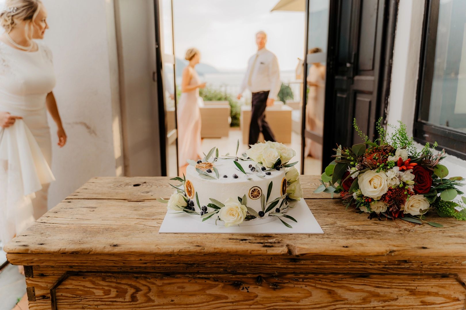 For their destination wedding in Italy, our couple chose a minimalist white wedding cake with less icing than normal cakes have. Naked cakes are truly timeless, and perfect for intimate weddings like this. Topped with lemon slices and flowers, it becomes even more attractive and sumptuous.