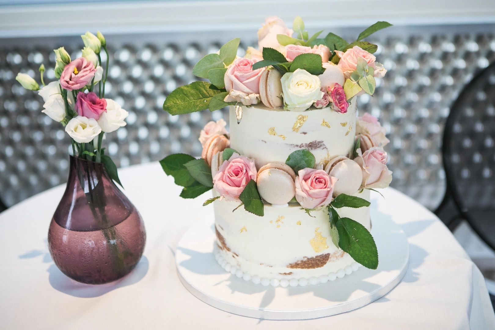Small two-tier, partially iced wedding cake for an intimate destination wedding in Paris. Decorated with fresh flowers and pale pink macarons.