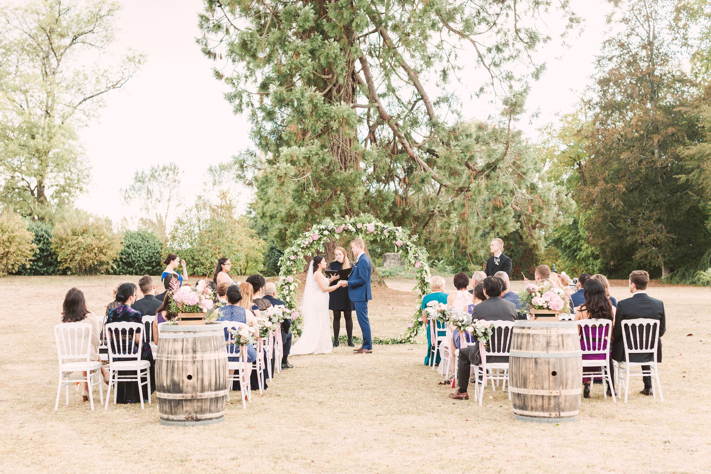Pastel decor and autumn trees for a Bordeaux small wedding