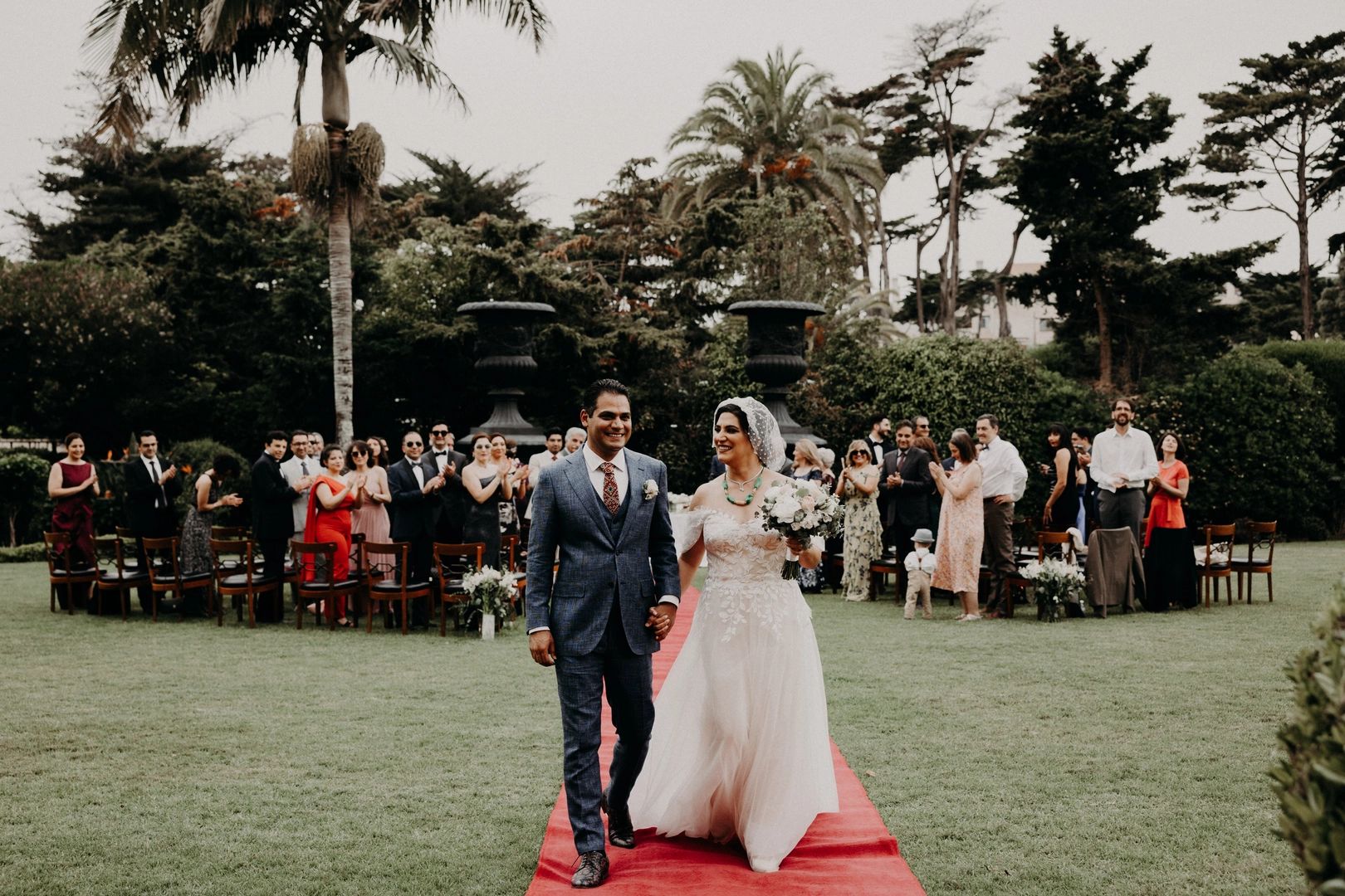 Bride wears blusher veil for a garden wedding in Cascais