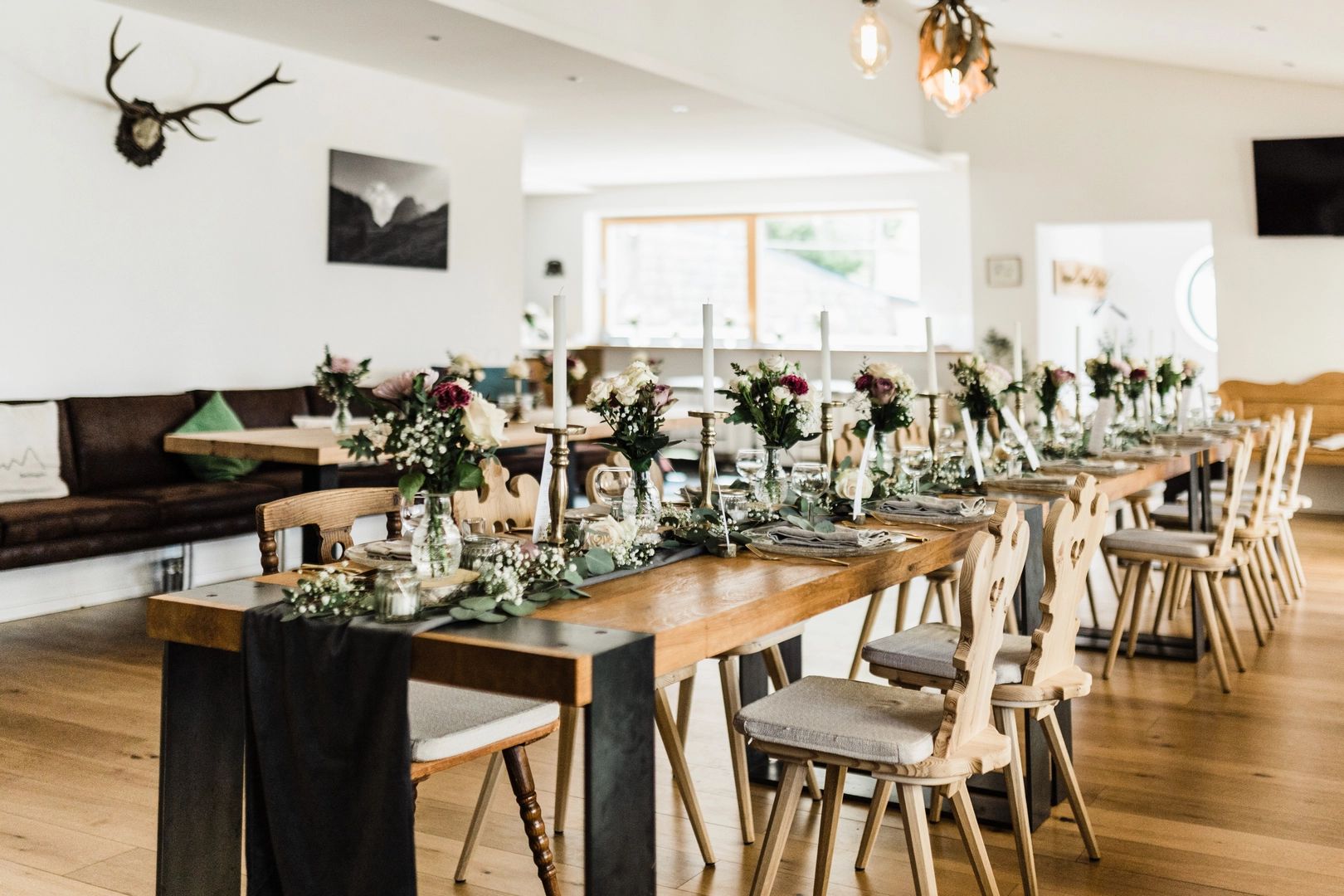 Nature-themed wedding: foliage garlands hanging from the ceiling