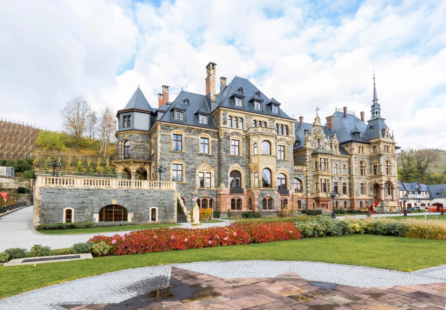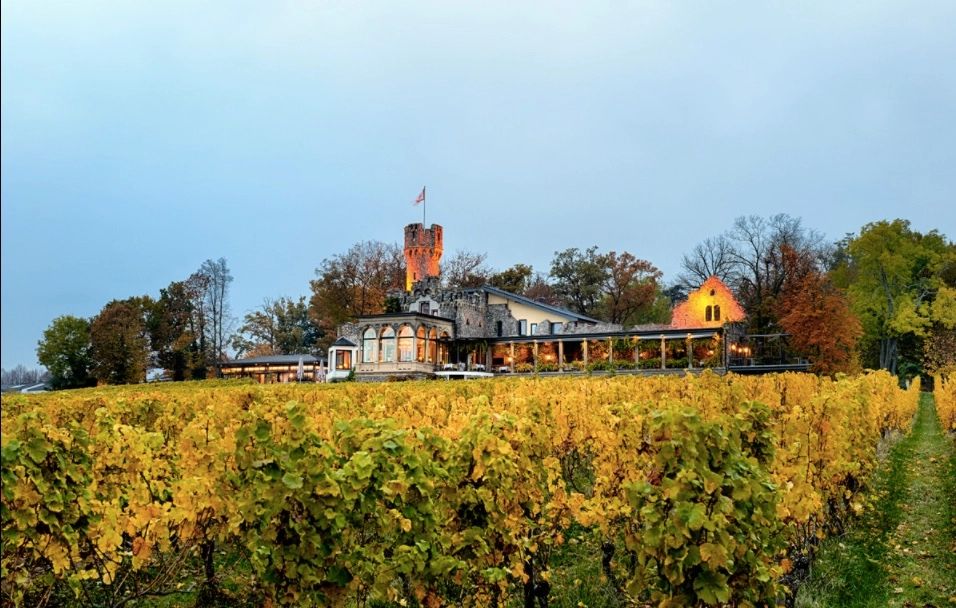 Luxury castle hotel with stone turret and Rhine Valley views